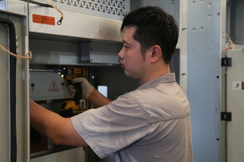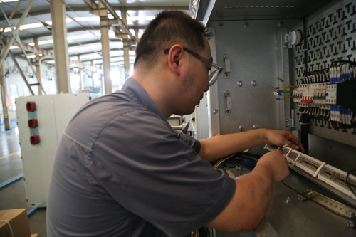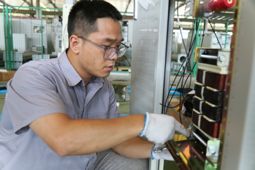 圖為自動化部員工在車間蒸騰的氣息里,完成無錫游圣變一體化電源裝配工作,這是他們的一份責(zé)任、一份堅守、一份擔(dān)當(dāng)。
